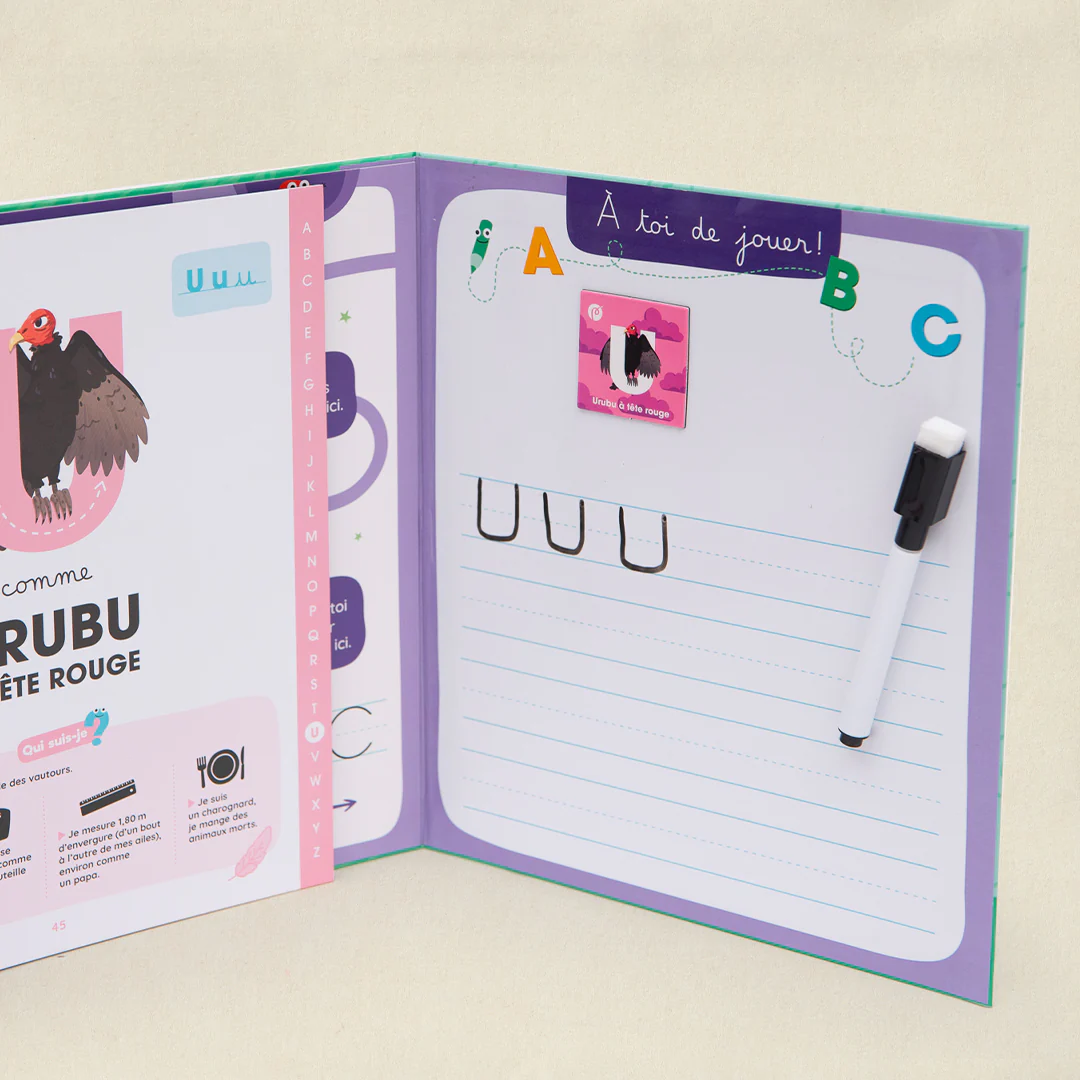 Et grâce à son tableau et son feutre effaçables, ce livre-coffret lui permet aussi de s’entraîner à tracer les lettres et même à écrire : c’est le début de plein de belles histoires…