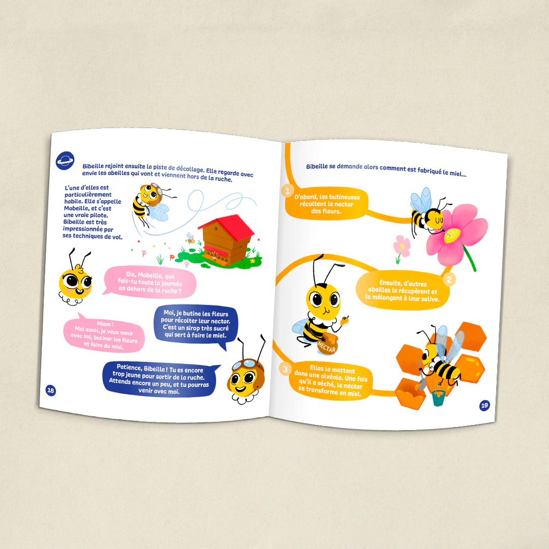 Elle t’emmène en visite à la rencontre d’autres abeilles de la ruche pour découvrir comment elles vivent, comment elles récoltent le nectar pour le transformer en miel, et comment tu peux toi aussi les aider.