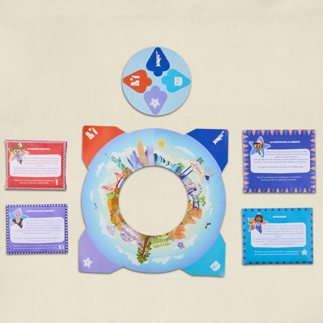 Grâce à ton jeu de piste, traverse les États-Unis et réalise des créations surprenantes à chaque étape ! Fabrique un burger en carton, ton étoile d’Hollywood, une maquette du Grand Canyon en 3D et même une mini Statue de la Liberté